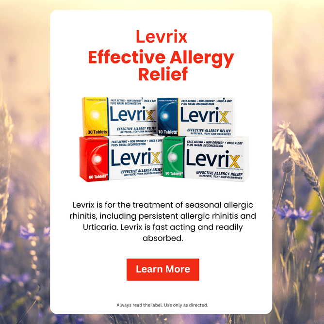 Levrix offers fast, effective relief from allergy symptoms, allowing you to breathe easy and enjoy life without the burden of allergies holding you back. With its rapid onset of action, once-daily dosing, and minimal side effects, Levrix is a game-changer for anyone seeking relief from seasonal allergies and hay fever. Say goodbye to allergy woes and hello to a life free from sneezing and sniffles with Levrix.